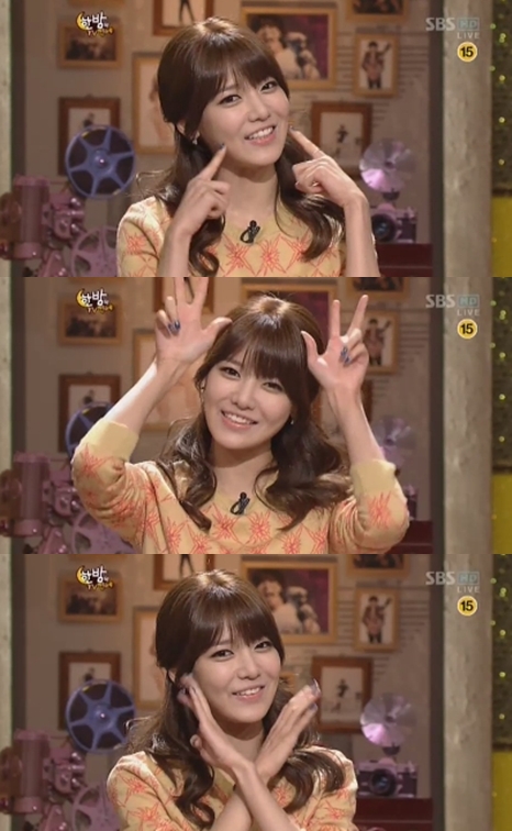 소녀시대 수영은 11월 21일 방송된 SBS '한밤의 TV연예'에서 최근 유행하는 귀요미 애교로 남성팬 마음을 녹였다.