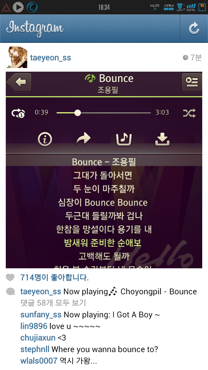 130416 태연 인스타그램 :: Now playing 조용필 - Bounce (태연 댓글1)