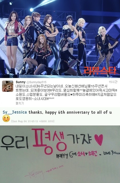 지난 4일 소녀시대 써니는 자신의 트위터를 통해 “내일이 소녀시대 6주년 되는 날이네. 오늘 신화선배님들 15주년 콘서트 봤는데 되게 좋아보여!! 우리도 열심히 할게 늘 곁에 있어줘서 고마워!! 소원도, 스태프분들도 그리고 우리 멤버들도♥ 하루 미리 축하해!! 지금처럼 앞으로도 영원히~ 소녀시대!!”라는 글을 게재해 소녀시대 6주년을 알렸다.