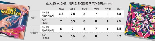대중음악평론가들은 앨범에 대해서는 2NE1에 무게를 더 실어줬다. 김윤하 평론가는 “소녀시대는 ‘아이 갓 어 보이’ 이후 몸에 잔뜩 들어갔던 힘을 빼고 쉬어가는 징검다리 같은 선택을 한 반면, 2NE1은 자신들이 기존에 가지고 있는 모든 걸 집대성한 필살기 같은 앨범을 갖고 돌아왔다”고 했다. 강일권 평론가도 “R&B, 힙합, 일렉트로닉 댄스 음악이 세련되게 조화를 이룬 앨범”이라고 2NE1의 앨범을 평가했고, 이대화 평론가는 “느린 곡들의 서정성과 멜로디도 여느 발라드 가수들 못잖게 훌륭하다”고 칭찬했다. 반면 김봉현 평론가는 “해외 작곡가들과의 긴밀한 협력하에 창조한 훌륭한 사운드, 익숙하지만 진부하다고 말하기 힘든 멜로디”를 꼽으며 소녀시대의 손을 들어줬다.