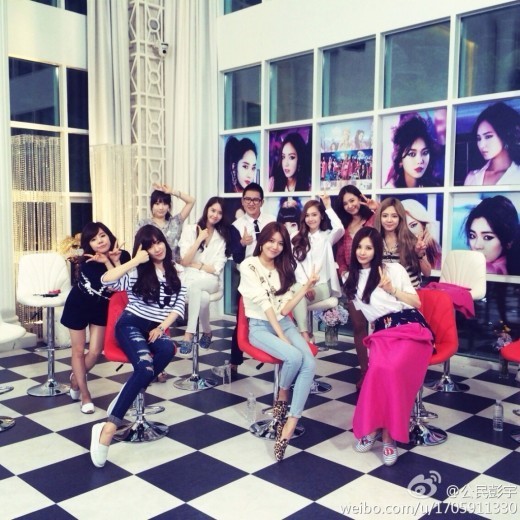장쑤위성TV '최강천단' 진행을 맡은 중국 방송인 펑위는 지난 11일 오후 자신의 웨이보(중국 SNS)에 소녀시대 멤버 전원과 함께 찍은 사진으로 녹화 현장을 살짝 공개했다.