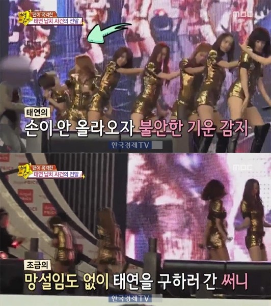 이에 송은이는 “모르는 사람이 태연을 끌고 가는 걸 본능적으로 잡은 거냐”고 물었고, 써니는 “너무 이상하다는 생각이 들었다. 스태프라기에는 너무 강제로 태연을 잡고 내려가는 것 같아서”라고 답했다.