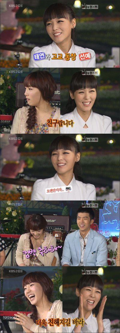 그러자 김승우는 "태연이 꽃이잖아요"라며 너스레를 떨었고 태연은 웃음으로 대답했다. 또 태연은 "라이벌 의식이라기보다는 선예씨랑은 같은 고등학교를 나왔다"며 "오랜만에 봤다. 컴백 축하한다"고 환영했다.