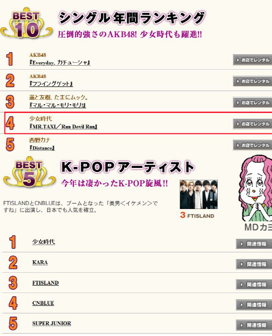 소녀시대는 일본 츠타야에서 발표한 '2011 인기 CD/DVD 렌탈 순위'에서 '미스터택시/ 런데빌런'로 4위를, '지'로 9위를 차지했다. 츠타야는 일본 최대 CD·DVD 판매 및 렌탈