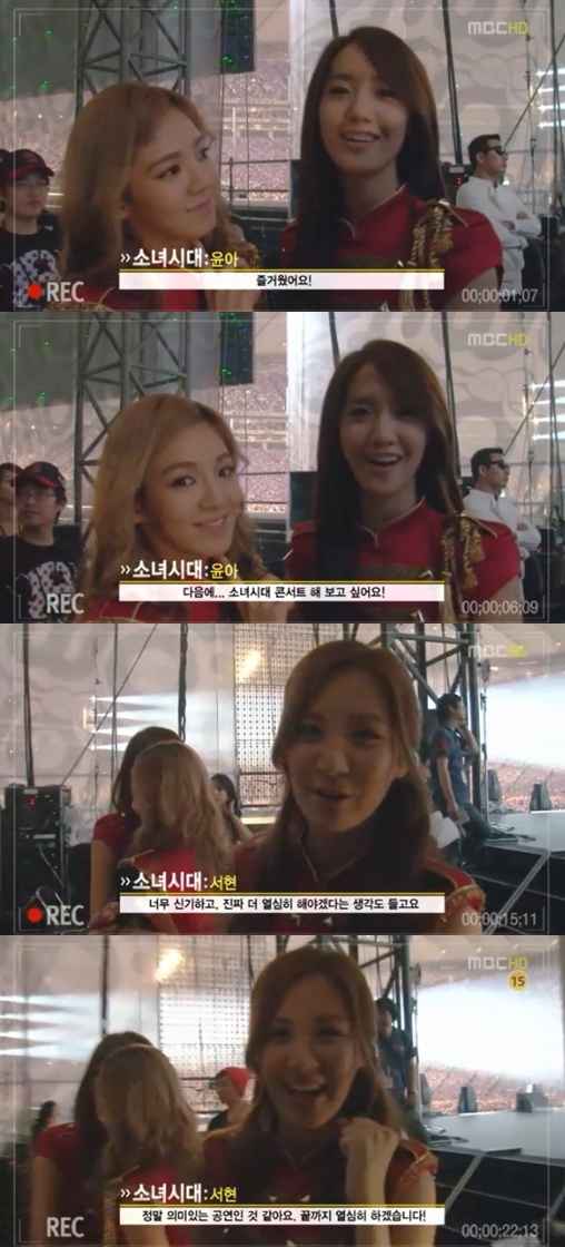 4월9일 방송된 MBC ‘K-POP 스페셜 콘서트 SM Town Live in Tokyo’에서 무대를 마치고 내려온 소녀시대 윤아, 효연, 서현 인터뷰가 방송됐다.