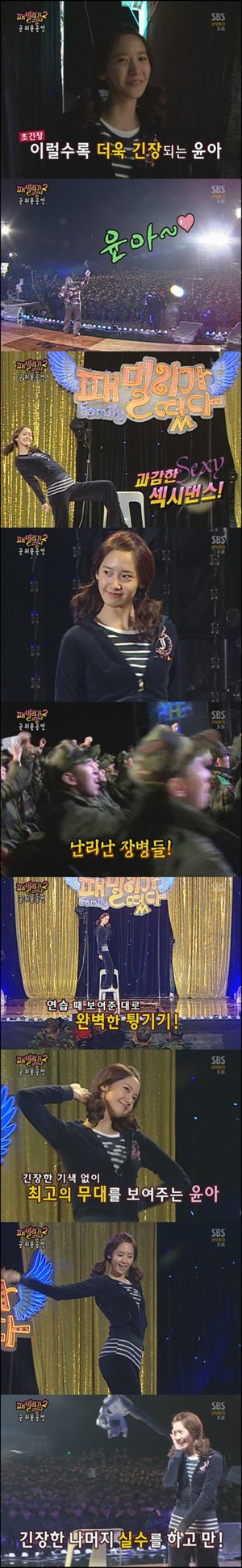 자체였다. 군인들은 윤아의 손짓 하나하나를 행여 놓칠세라 집중하는 모습을 보였다. 윤아 역시 섹시함이 철철 묻어나는 의자춤과 털기댄스을 선보여 모두를 놀라게 했다.