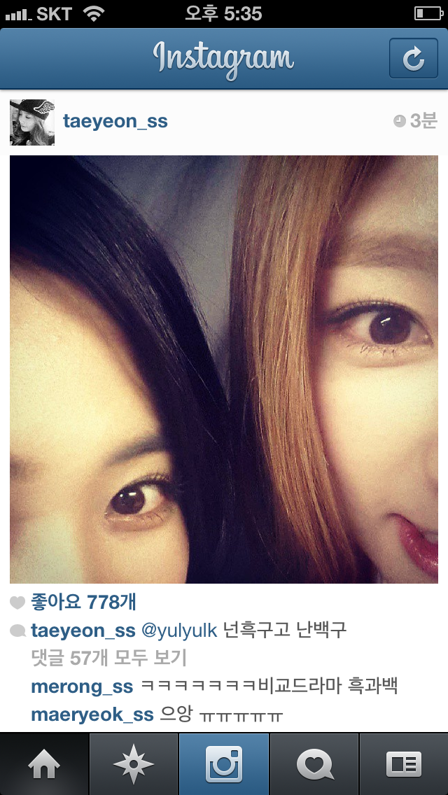 130801 태연 인스타그램 :: @yulyulk 넌흑구고 난백구 (+유리 댓글1)